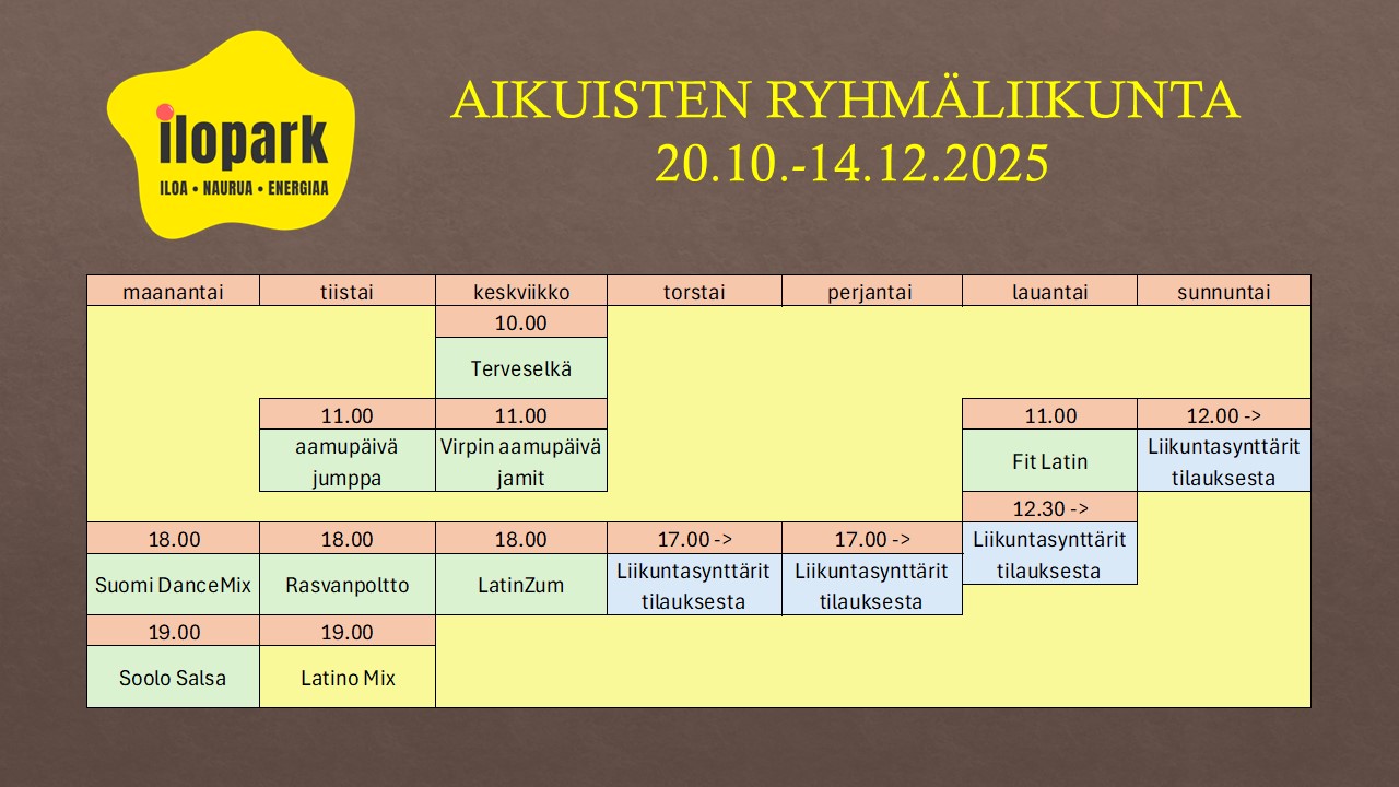Iloa-salissa on hyvin tilaa, mutta Naurua -salissa sekä Energiaa -salissa on rajallinen määrä osallistujia tunnilla.